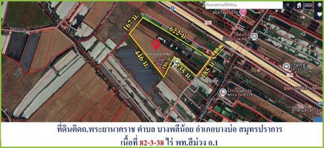 ขายที่ดินผังสีม่วง บนถนนบางนาตราด กม.32 ขาออก ติดถนนพญานาคราช บางพลีน้อย บางบ่อ สมุทรปราการ