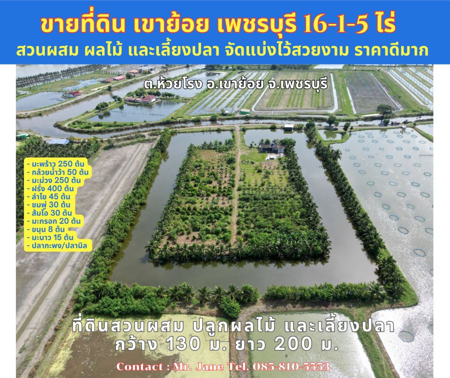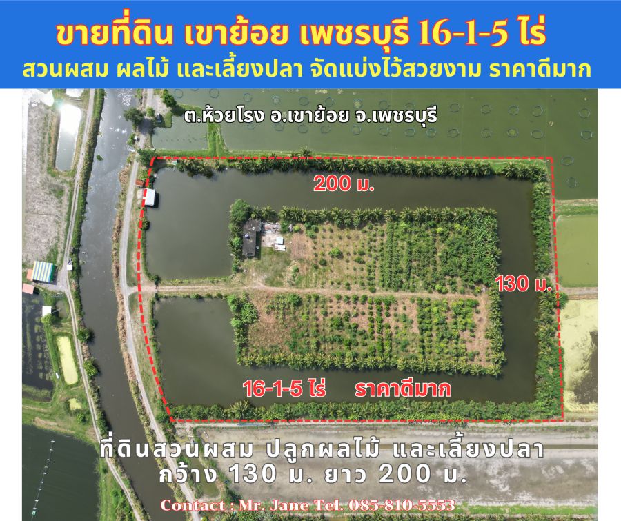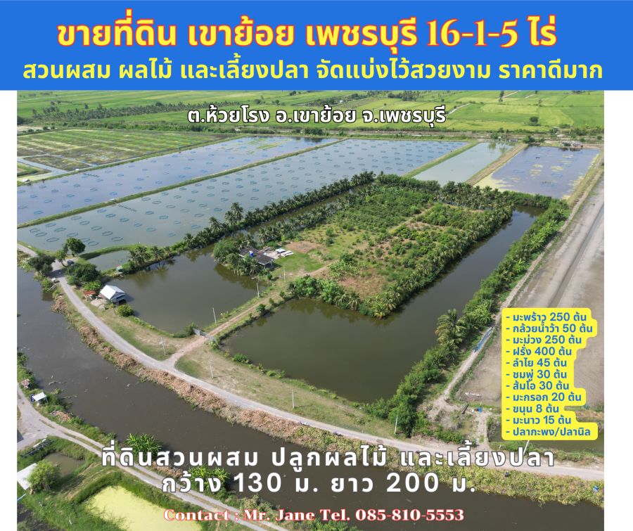 ขายที่ดิน สี่เหลียมสวย ทำสวนผลไม้ผสม และเลี้ยงปลา วิวดีมาก ตำบลห้วยโรง อำเภอเขาย้อย เพชรบุรี 16-1-5 ไร่ ราคาดีมาก ขาย 390,000 บาทต่อไร่ เท่านั้น (หรือ 975 บาทต่อตรว.) รวมราคาขาย 6,342,375 บาท ราคาถูกมากๆครับ