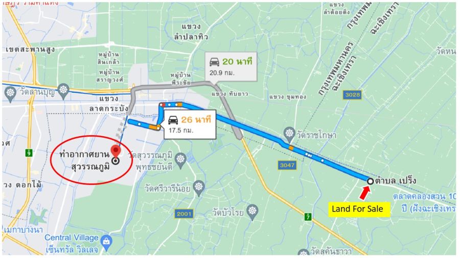 - ที่ดิน26 ไร่ 3 งานติดถนน เทพราช-ลาดกระบัง ใกล้สนามบิน สุวรรณภูมิ