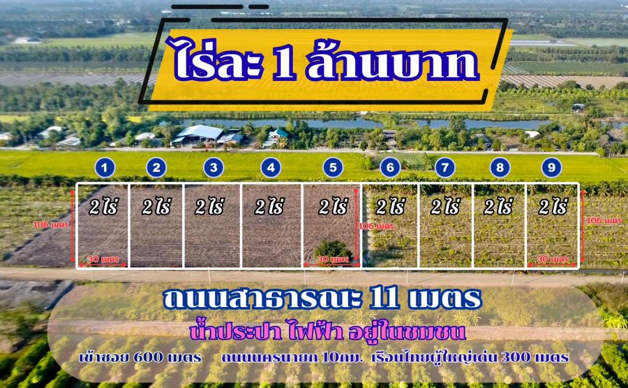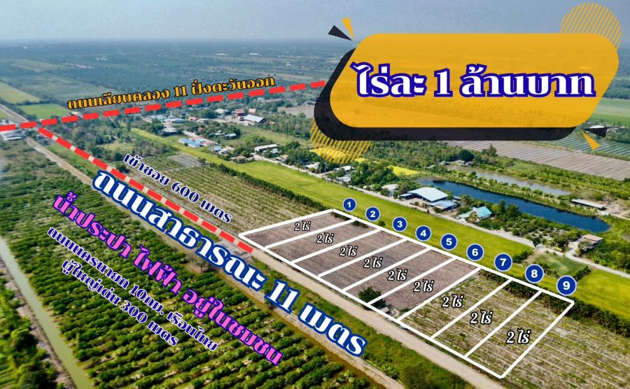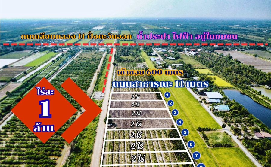 ที่ดินทำเลทอง ขายถูกไร่ละ 1 ล้านบาท ถนนกว้าง 11 เมตร น้ำประปา ไฟฟ้า ครบพร้อมใช้ ขายยกแปลง 2 ไร่ สร้างโกดัง คลังสินค้า หรือบ้านสวน