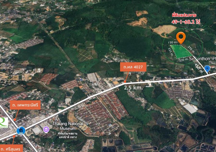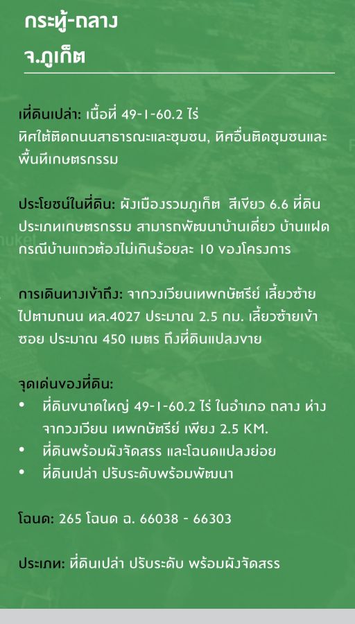 ขายที่ดินเปล่า 49-1-60 ไร่ ในอำเภอถลาง ภูเก็ต ติดถนนสาธารณะและชุมชน พร้อมพัฒนาเป็นหมู่บ้านจัดสรร และแบ่งโฉนดเป็นแปลงย่อยแล้ว