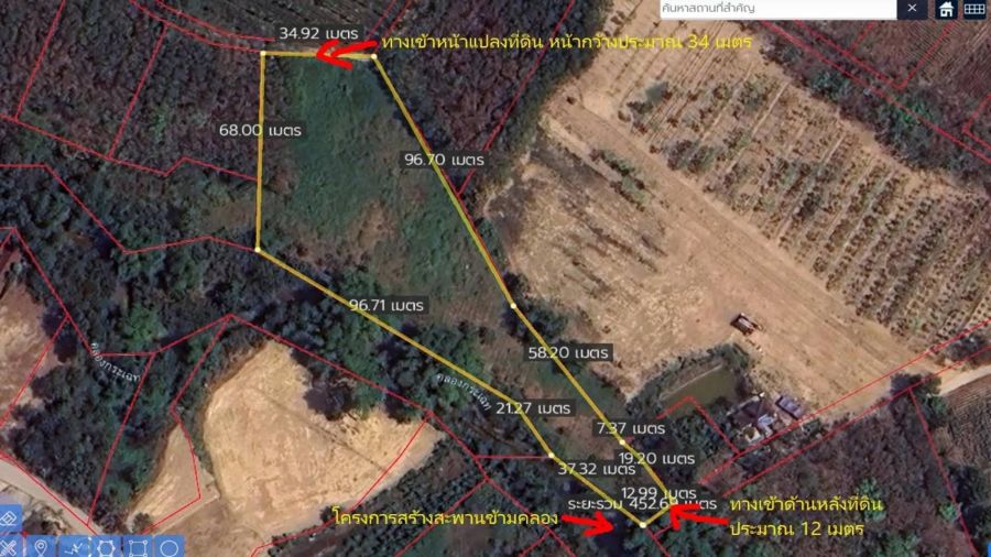 - แปลงที่ดินปัจจุบัน เป็นที่ดินเปล่า ติดคลองกระเฉท น้ำไฟลผ่านตลอดปี ระยะ 155 เมตร