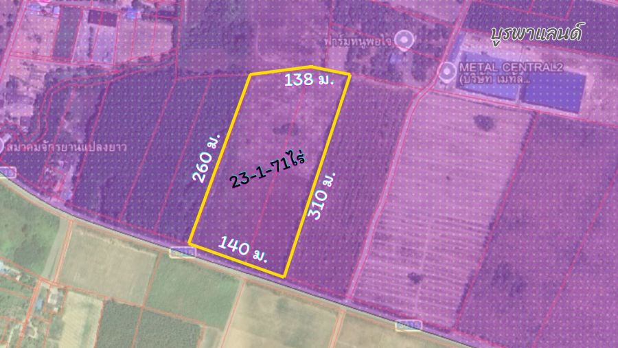 ขายที่ดินใกล้นิคมเกตเวย์ แปลงยาว ฉะเชิงเทรา 23-1-71ไร่ สีม่วงลาย เหมาะทำ โรงงาน โกดัง คลังสินค้า บ้านจัดสรร