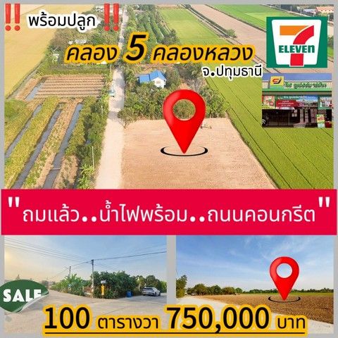 ที่ดินถมแล้ว ติดคอนกรีต มีท่อระบายน้ำ คลอง 5 คลองหลวง น้ำไฟหน้าแปลง 100ตรว.7.5แสน฿ T.o86-3ol-6l6l
