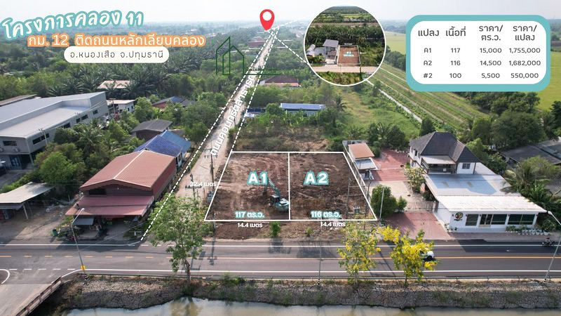 แปลง A2 ขนาดเนื้อที่ 116 ตารางวา หน้ากว้าง 14.4 เมตร ลึก 32.4 เมตร ราคา 14,500 บาท/ตารางวา หรือ 1,682,000 บาท ที่ดิน 2แปลงอยู่ติดกันปรับถมแล้วเรียบร้อย ที่ดินอยู่ในทำเลที่มีศักยภาพสูง
