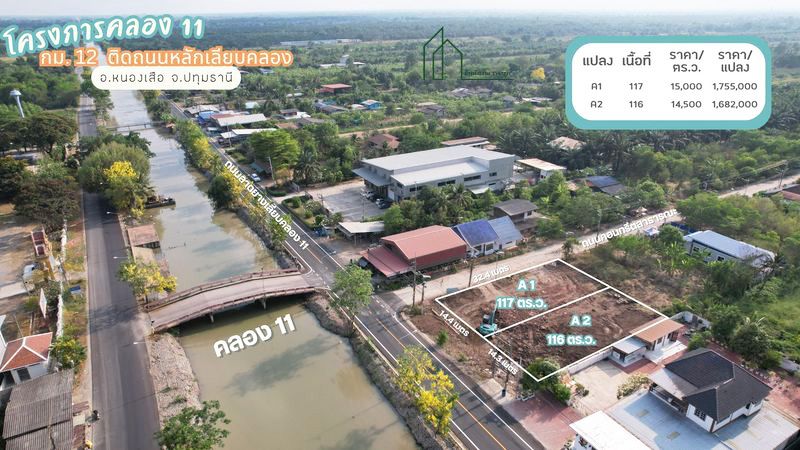 แปลง A1 ขนาดเนื้อที่ 117 ตารางวา หน้ากว้าง 14.4 เมตร ลึก 32.4 เมตร ติดถนน 2 ด้าน ราคา 15,000 บาท/ตารางวา หรือ 1,755,000 บาท