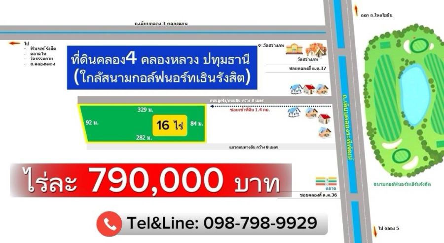 ที่ดินคลอง4 คลองหลวง ปทุมธานี ไร่ละ 790,000 บาท 16ไร่ หน้ากว้าง 110 เมตร (ใกล้สนามกอล์ฟนอร์ทเธินรังสิต)