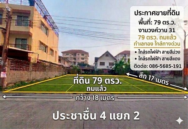 ขายที่ดิน 79 ตรว.ประชาชื่น 4 แยก 2 งามวงศ์วาน 31 นนทบุรี ผังสวยถมแล้ว ใกล้ทางด่วน รถไฟฟ้า 2 สาย 086-5685-191