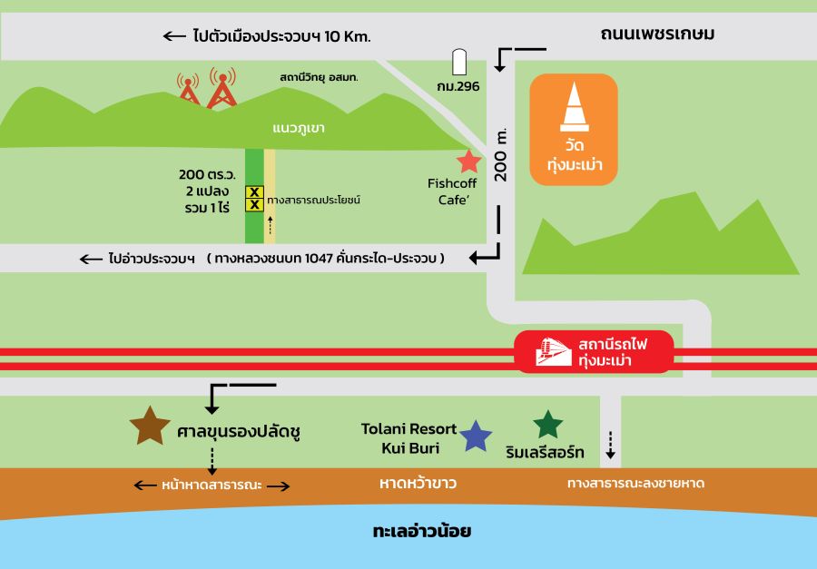 -ระยะทางจากที่ดินไปประมาณ10 กม. ไปถึงอ่าวประจวบ มีร้านอาหารทะเล โรงแรม สถานที่ราชการ ถนนคนเดินวันเสาร์อาทิตย์