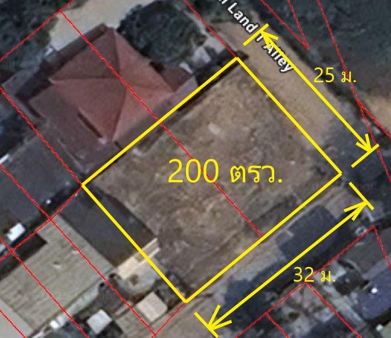 # พื้นที่เป็นสี่เหลี่ยมถนน 2 ด้าน หน้ากว้าง 25 เมตร ลึก 32 เมตร