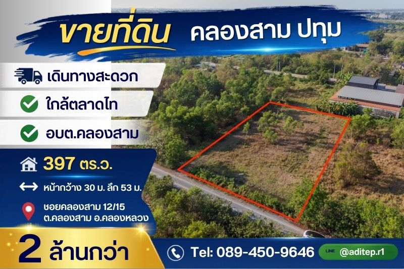 ราคาเข้าซื้อเพียง 2.78 ล้านบาท สำหรับที่ดินเกือบ 1 ไร่ในทำเลที่อยู่ห่างตลาดไทไม่กี่กิโลเมตร และโซนคลองหลวงมีแนวโน้มราคาที่ดินขยับขึ้นอย่างต่อเนื่องตามการขยายตัวของเมืองและดีมานด์พื้นที่โลจิสติกส์ในปริมณฑล ผู้ที่ถือครองไว้ในระยะ 5–10 ปี มีโอกาสได้ Capital Gain ที่ดี