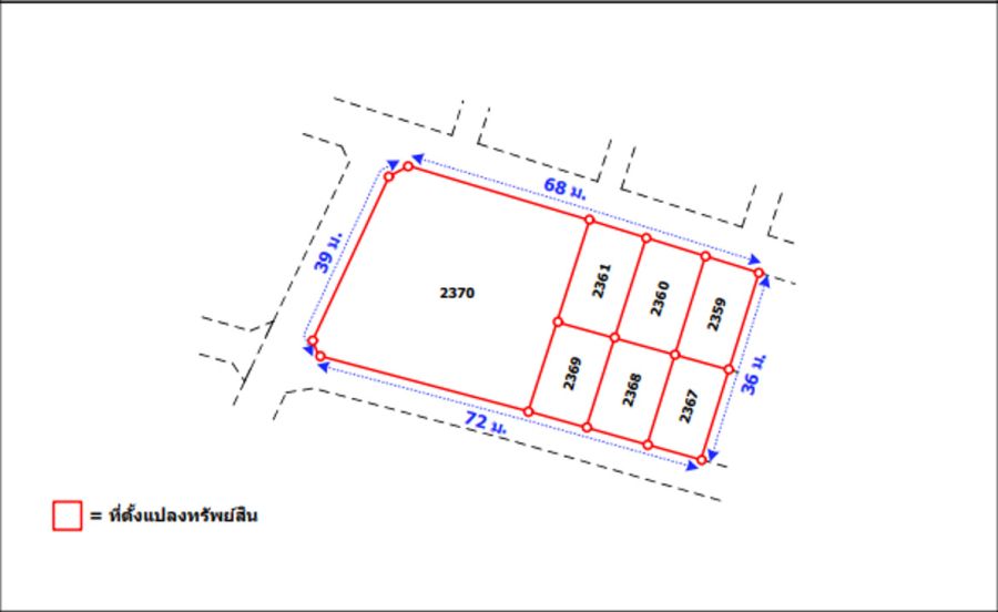 หน้ากว้าที่ดิน : กว้าง 39 * ลึก 72 เมตร ( รูปคล้ายสี่เหลี่ยมผืนผ้า )