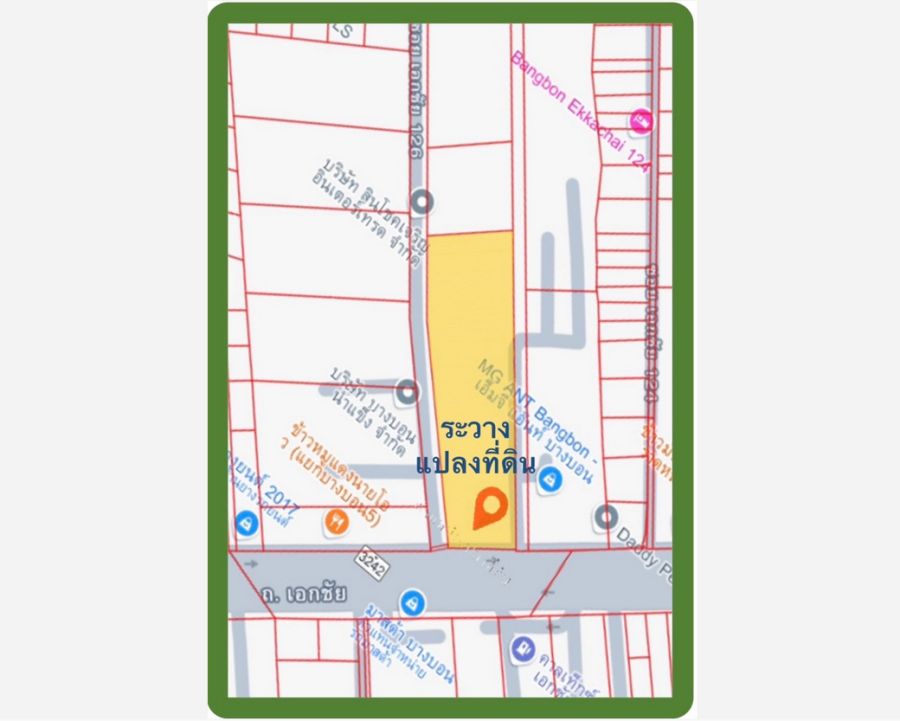 ขาย หรือ ให้เช่า ที่ดินเปล่า ติดถนนเอกชัย ใกล้สี่แยกถนนเอกชัยตัดกับถนนบางบอน 5 แนวเขตด้านข้างที่ดินติดซอยเอกชัย 126 อยู่ในทำเลที่มีธุรกิจ SME และคลังสินค้าจำนวนมาก