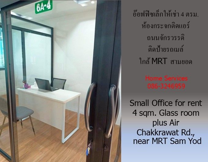 Small Office for rent Chakkrawat Rd.,4 sqm. Glass room plus Air, next to bus stop near MRT Sam Yod