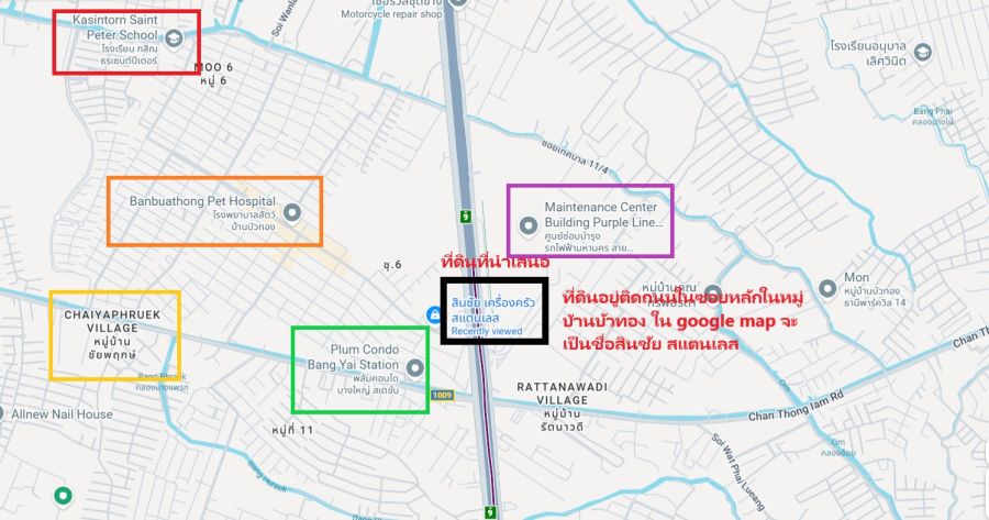 บริเวณที่ดินเป็นแหล่งชุมชน คนพลุกพล่านยิ่งช่วงเช้า เย็นคนผ่านเยอะมาก ข้างในเป็นชุมชนหมู่บ้านบัวทอง คนอยู่อาศัยหนาแน่นหลายร้อยหลัง มีโรงเรียนนานาชาติ กสิณธร ด้านหน้าเป็นสภถานีรถไฟฟ้า มีป้ายรถเมล์