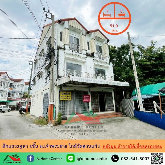 ขายตึกแถว2คูหา 3ชั้น 51.9ตรว. หลังมุม ม.เจ้าพระยา9 ใกล้วัดสวนแก้ว ค้าขายได้ ที่จอดรถเยอะ