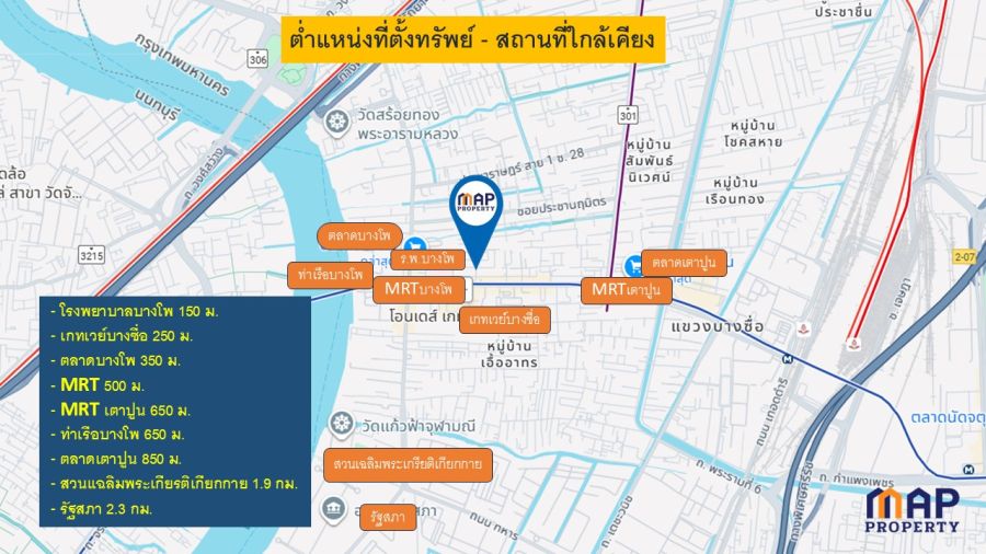 - เดินทางสะดวกตั้งอยู่ในย่านบางโพซึ่งเป็นย่านเก่าแก่ที่มีการค้าขายคึกคักมาอย่างยาวนาน และยังใกล้กับถนนใหญ่หลายสายทำให้การเดินทางเข้า-ออก เมืองเป็นเรื่องง่าย