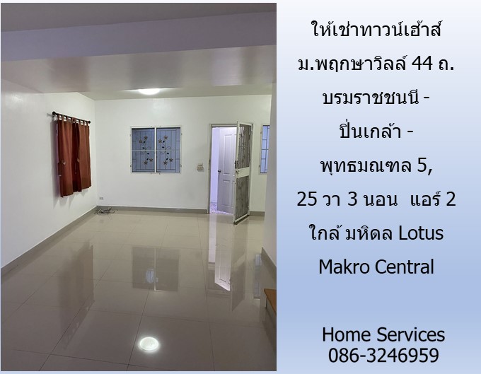 ให้เช่าทาวน์เฮ้าส์ ม.พฤกษาวิลล์ 44 ถ.บรมราชชนนี-ปิ่นเกล้า-พุทธมณฑล 5, 25 วา 3 นอน แอร์ 2 ใกล้ มหิดล Lotus Makro Central