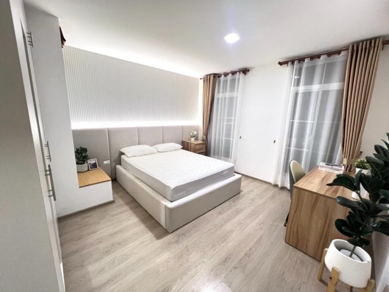 ห้องนอนใหญ่ : เตียงบิวท์อินและที่นอน 5 ฟุต, หมอน 2 ใบ , ผ้ารองกั้นเปื้อน , ตู้เสื้อผ้าบิวท์อินขนาดสูงใหญ่, โต๊ะและตู้วางทีวี, กรอบรูปตกแต่ง , แอร์