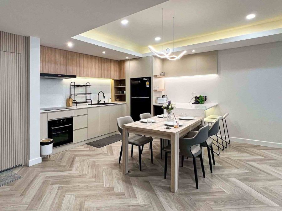 - ครัวบิ้วท์อินขนาดใหญ่ มีเตาอบ เตาไฟฟ้า ฮู้ดดูดควัน ตู้เย็นไมโครเวฟ