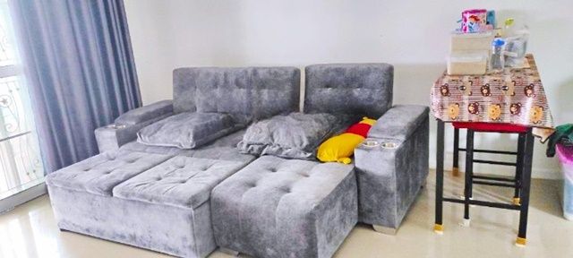 – ชั้นล่าง: โซฟาขนาดใหญ่, ชั้นวางทีวี (ไม่รวมทีวี), ตู้เย็น