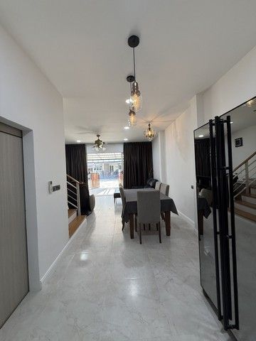 ชั้นล่างเป็นส่วนนั่งเล่น มีโซฟา โต๊ะทานข้าว ตู้เย็น ด้านหลังเป็นครัว มีห้องน้ำpowder room มีห้องเก็บของ เครื่องซักผ้า