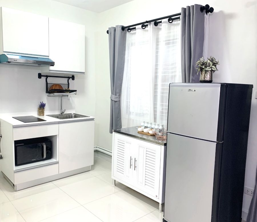 1 โซนครัว Built-in ปูกระเบื้องผนังกันเลอะพร้อมเครื่องดูดควัน เตาไฟฟ้า ซิงค์ล้างจาน
