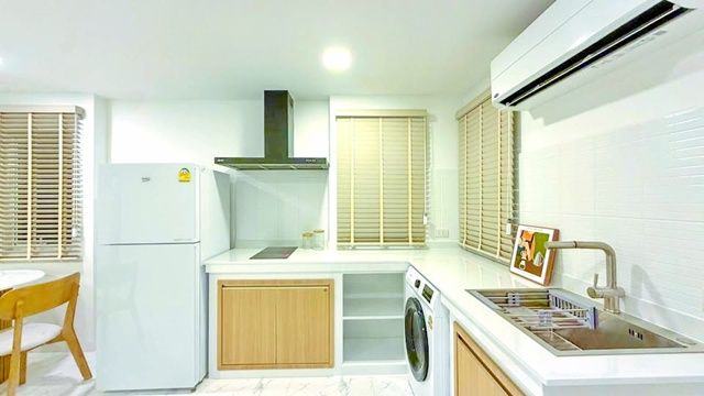 ครัวบิวท์อิน พร้อมเตาไฟฟ้า เครื่องดูดควัน ตู้เย็น และเครื่องซักผ้าอบผ้า