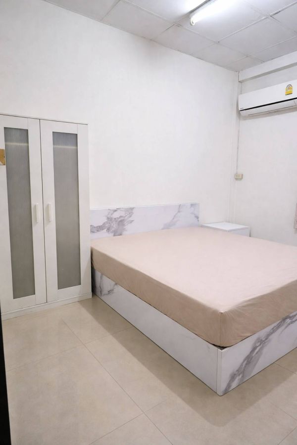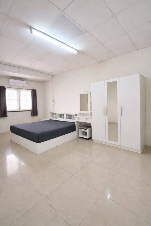 ห้องนอน มีแอร์ เตียงพร้อมที่นอน ตู้เสื้อผ้า โต๊ะแป้ง