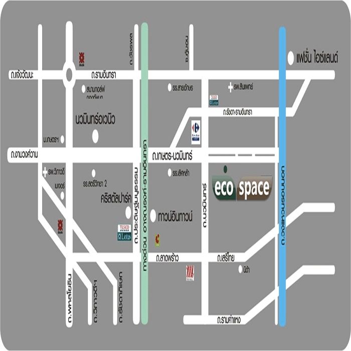 การเดินทาง เริ่มจาก ถนนเกษตร-นวมินทร์ หน้าห้างบุญถาวร สาขาเกษตรนวมินทร์ > กลับรถ > ทาวน์โฮม อีโคสเปซ II เกษตร-นวมินทร์ *จากหน้าห้างบุญถาวร ระยะทาง 3.1 กิโลเมตร