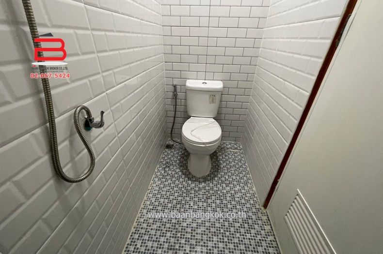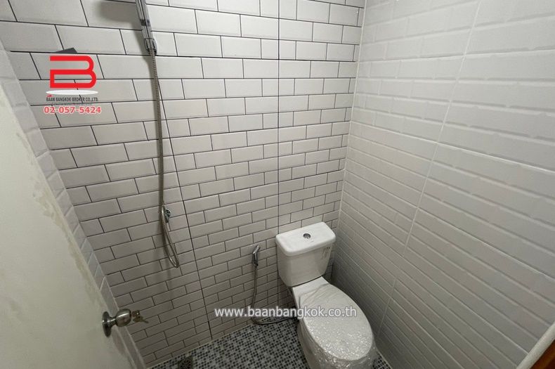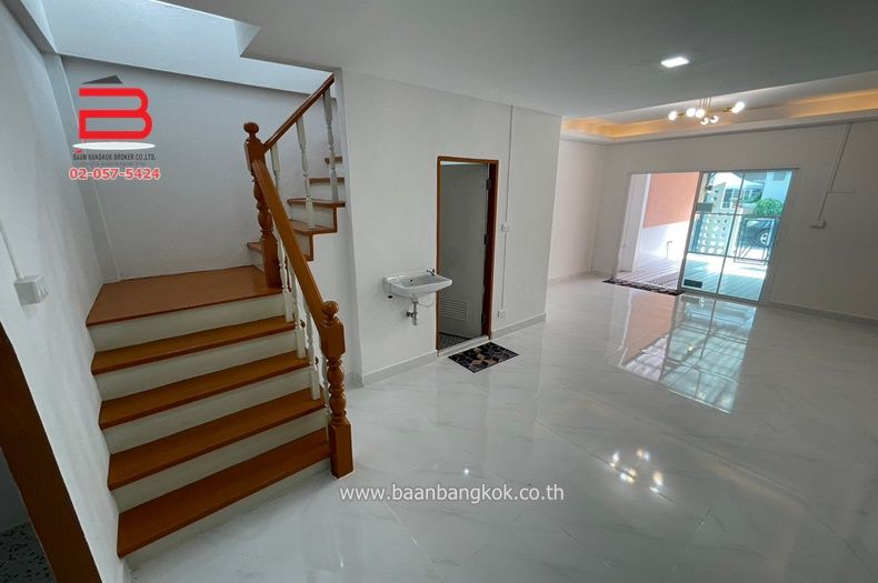 การตกแต่ง : ปรับปรุงใหม่ทั้งหลัง พื้นชั้นล่างและชั้นบนปูด้วยกระเบื้องเซรามิค ขนาด 60x60 บันไดไม้ มีตู้เสื้อผ้า ฝ้าเพดานเป็นฝ้าหลุมพร้อมซ่อนไฟ LED สไตล์โมเดิร์น สีภายในและฝ้าเพดานสีขาว ภายนอกสีส้มสลับขาวให้ความรู้สึกทันสมัย ห้องครัวพร้อมเคาน์เตอร์ ติดพัดลมดูดอากาศในห้องน้ำทั้ง 2 ห้อง มีปั้มน้ำ+แท็งค์น้ำ