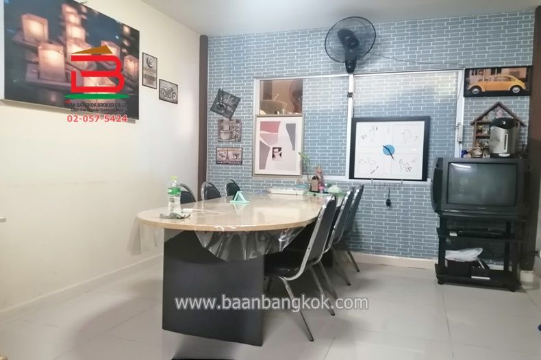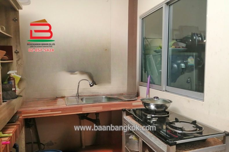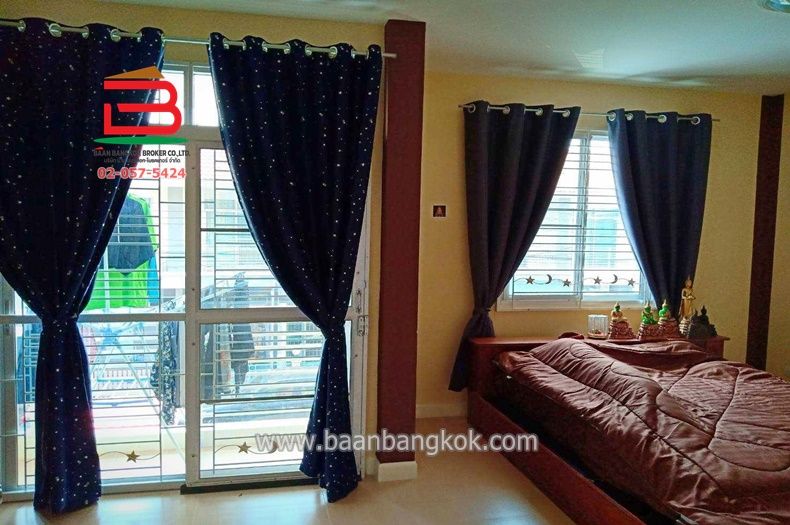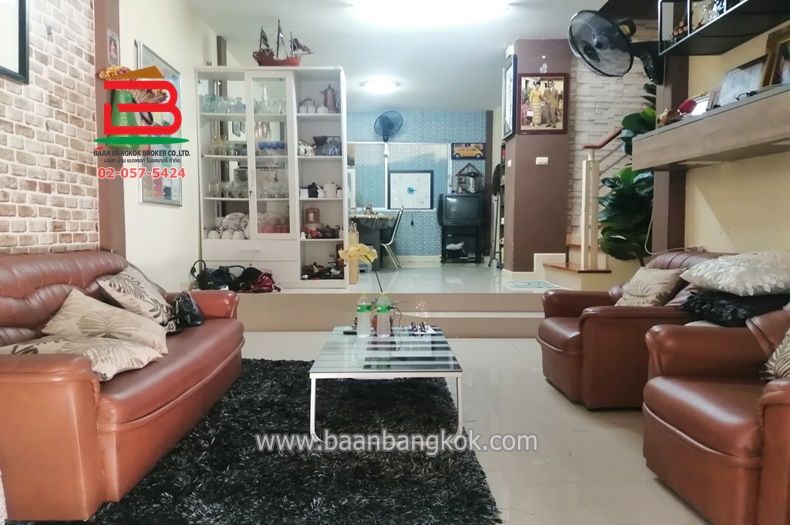 การตกแต่ง : ขายพร้อมเฟอร์นิเจอร์บางส่วน ชั้น 1 เป็นห้องรับแขก พื้นยกระดับ 2 ขั้น เป็นบริเวณห้องทานอาหาร บันไดเป็นพื้นไม้แดง ราวบันไดเป็นสแตนเลส มี 1 ห้องน้ำ ต่อเติมห้องครัวลงเข็ม 6 เรียบร้อยไม่ทุรด ชั้น 2 มี 3 ห้องนอน 1 ห้องน้ำ พื้นปูกระเบื้องทั้ง 2 ชั้น ติดมุ้งลวด-เหล็กดัด และผ้าม่านทั้งหลัง มีปั้มน้ำ-แท็งค์น้ำ แอร์ 2 เครื่อง ต่อเติมหน้าบ้าน