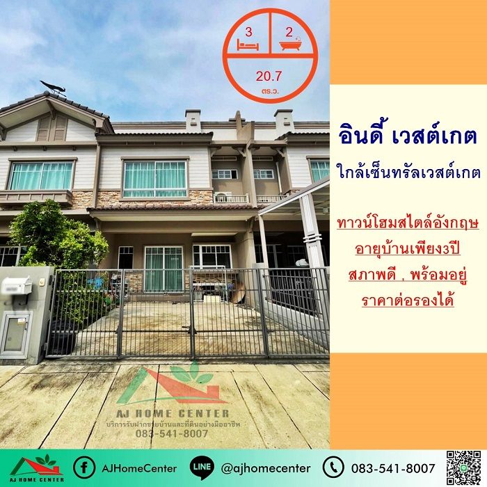 ขายทาวน์โฮม20.7ตรว. ม.อินดี้ เวสต์เกต บ้านใหม่สภาพดี แต่งสวยสไตล์อังกฤษ จัดกู้ฟรี