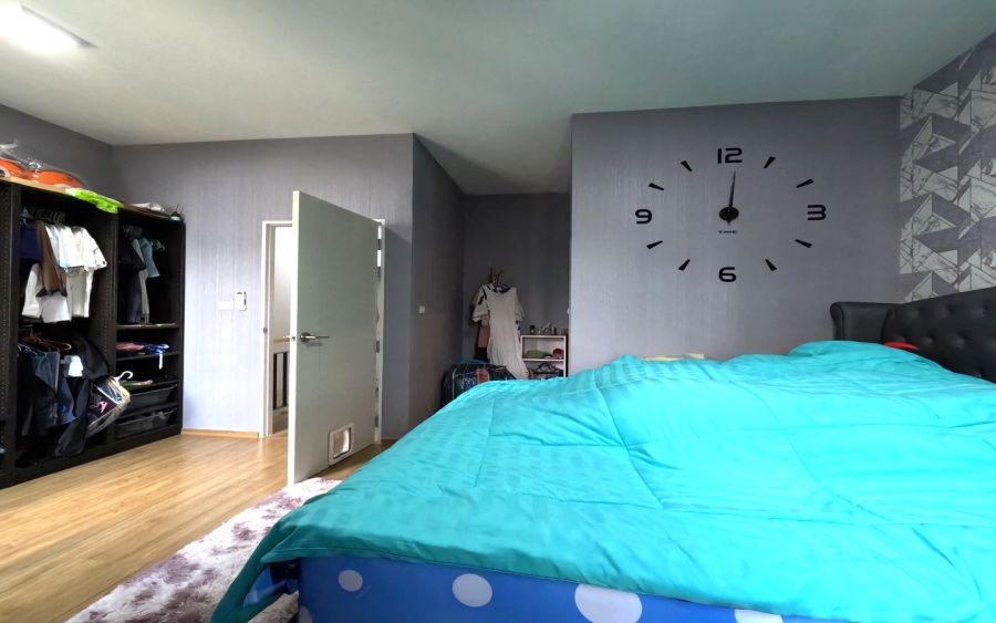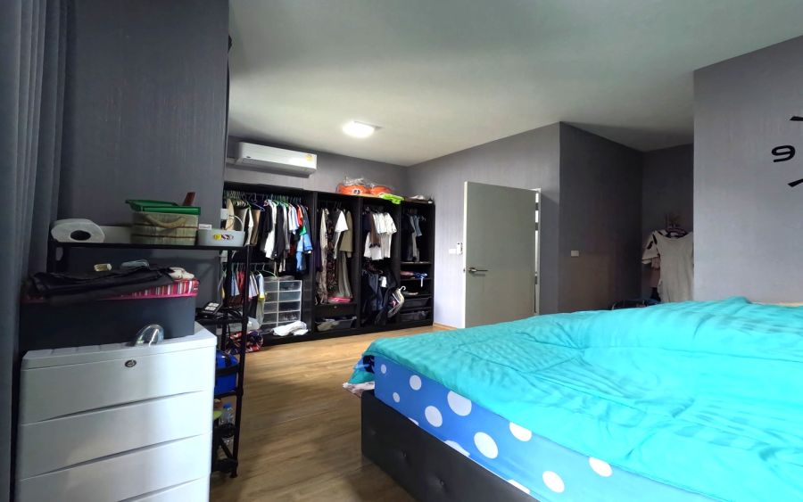วัสดุปูพื้นชั้น 2 ปูลามิเนต ห้องมาสเตอร์จะใหญ่มากติดวอลเปเปอร์เก๋ไก๋ และมีห้องน้ำในตัวพร้อมเฟอร์ครบอาทิ เตียง ตู้เสื้อผ้า ชุดผ้าม่านหรูอย่างดี แอร์ 1 เครื่อง. หน้าต่างเป็นบานเลื่อนกระจกพร้อมมุ้งลวด ห้องดูโปร่งโล่ง อากาศถ่ายเทเพราะหน้าต่างหลายบาน มีห้องน้ำในตัว 1ห้องพร้อมเครื่องทำน้ำอุ่น