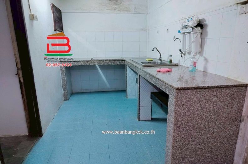 การตกแต่ง : พื้นปูกระเบื้อง ต่อเติมด้านหน้าใหม่ทำเป็นห้องนั่งเล่น ติดประตูเป็นกระจกสไลด์ ต่อเติมเคาน์เตอร์ครัวด้านหลังปูหินอ่อน ฝ้าแขวน ติดเหล็กดัด