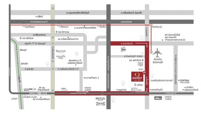 - ใกล้ห้างสรรพสินค้าเมกาบางนา, เซ็นทรัล วิลเลจ, มาร์เก็ต วิลเลจ สุวรรณภูมิ, โรบินสัน ลาดกระบัง และเดอะพาซิโอมอลล์ ลาดกระบัง