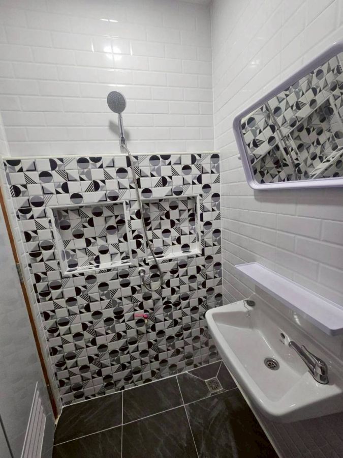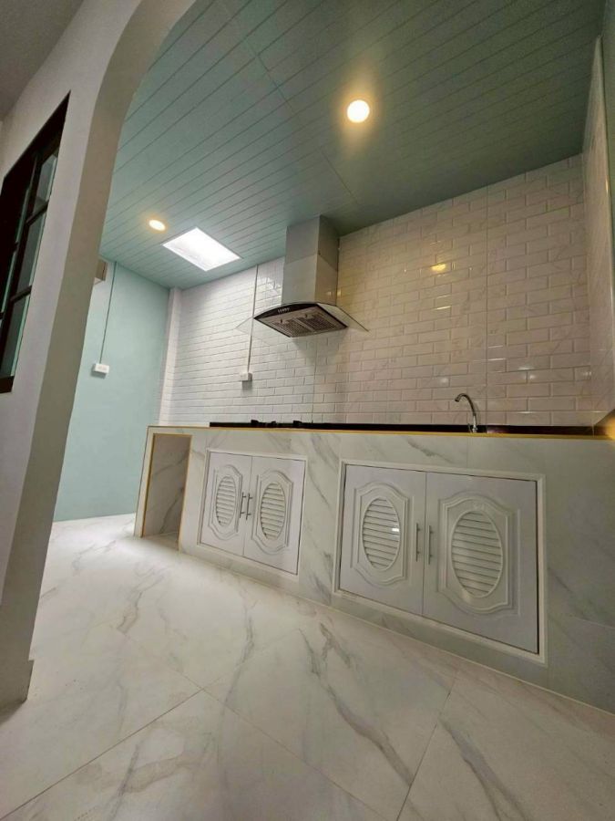 🏡 ตกแต่งใหม่ทั้งหลัง ฟรีเฟอร์นิเจอร์ทุกห้อง หิ้วกระเป๋าเข้าอยู่ได้เลย หลังบ้านต่อเติมครัว, เค้าเตอร์ครัวปูน พื้นชั้นล่างปูกระเบื้อง พื้นชั้นบนปูปาร์เก้