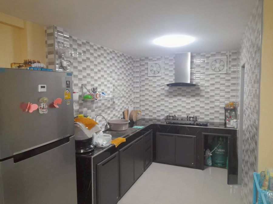 ห้องครัวรีโนเวทใหม่ มาพร้อมเคาน์เตอร์ครัว อ่างล้างจาน เตาแก๊ส และเครื่องดูดควัน พร้อมปูพื้นกระเบื้องคอตโต้แผ่นใหญ่ขนาด 60 X 60 เซนติเมตร สวยงามและทำความสะอาดง่าย