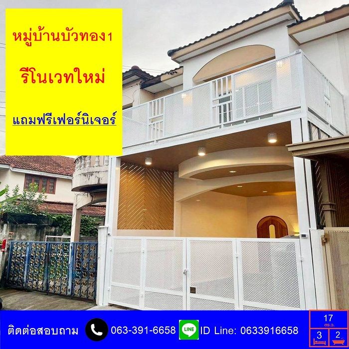 ขายทาวน์เฮ้าส์ เนื่อที่ 17 ตร.ว หมู่บ้านบัวทอง1 รีโนเวทใหม่ แต่งสไตล์มินิมอล แถมฟรีเฟอร์นิเจอร์