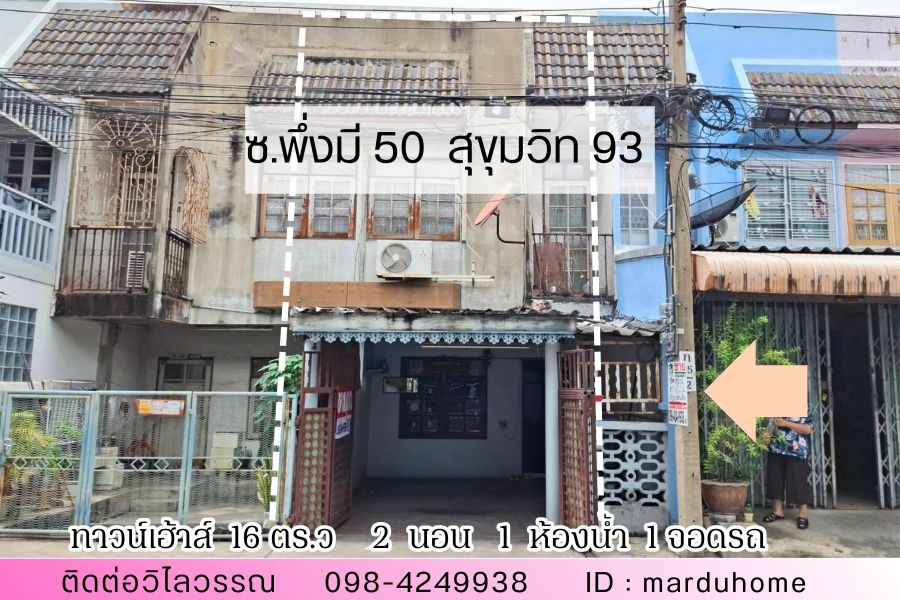 ขาย ทาวน์เฮ้าส์ 2 ชั้น ขนาด 16 ตร.ว. ซอย นิรันดร์วิลล่า ซอยพึ่งมี 50 ในซอยสุขุมวิท 93 ใกล้ BTS บางจาก เพียงไม่กี่นาทีจากสถานี เข้าออกได้หลายทาง ทั้งสุขุมวิท 93, ซอยอ่อนนุช 44 เหมาะทั้งสำหรับอยู่อาศัยเองหรือรีโนเวทเพื่อปล่อยเช่า/ขายต่อก็ได้ผลตอบแทนดี