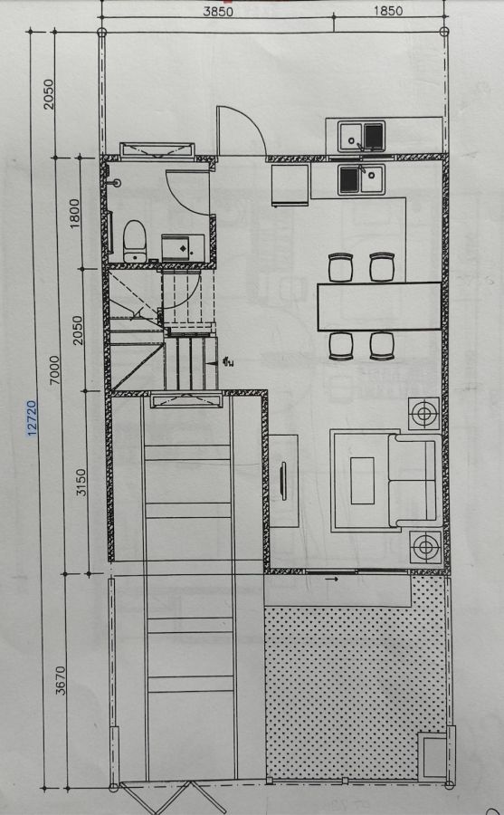 -ชั้นล่าง : พื้นปูด้วยกระเบื้องแผ่นใหญ่ มี 1 ห้องโถงรับแขกและนั่งเล่น, 1 ห้องเก็บของ, 1 ห้องน้ำ, 1 ที่จอดรถ,