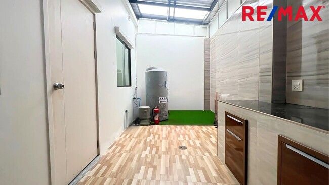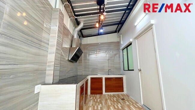 ต่อเติมครัวไทยหลังบ้านพร้อมใช้งาน ด้านหลังบ้านต่อเติมเป็นห้องครัวไทยขนาดใหญ่ 5.7 x 2.5 เมตร พร้อมเคาน์เตอร์ปูน อ่างล้างจาน เครื่องดูดควัน และช่องแสงธรรมชาติ ปูกระเบื้องผนังเต็มพื้นที่ ทำความสะอาดง่ายและใช้งานได้จริง
