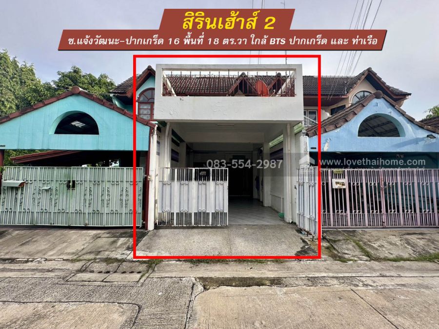 ขายทาวน์เฮ้าส์ 2 ชั้น 18 ตร.วา หมู่บ้านสิรินเฮ้าส์ 2 แจ้งวัฒนะ-ปากเกร็ด 16 ทะลุ แจ้งวัฒนะ-ปากเกร็ด 4 ได้ นนทบุรี สภาพสวย ต่อเติมครัว+ระเบียง+โรงรถ ใกล้แหล่งชุมชน-ตลาดปากเกร็ด เข้า-ออกได้หลายทาง ใกล้ BTS ปากเกร็ดและท่าเรือ