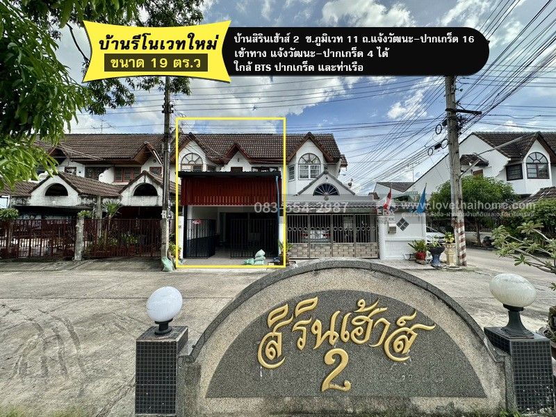 ขายทาวน์เฮ้าส์รีโนเวทใหม่ 2 ชั้น 19 ตร.วา หมู่บ้านสิรินเฮ้าส์ 2 ติดถนนภูมิเวท 11 ถ.แจ้งวัฒนะ-ปากเกร็ด 16 เข้าทาง (ถ.แจ้งวัฒนะ-ปากเกร็ด 4 ได้) ตรงข้ามสถานแรกรับเด็กอ่อนปากเกร็ด ทำเลดี ค้าขายได้ ที่จอดรถสะดวก เข้า-ออกได้หลายทาง ใกล้ BTS ปากเกร็ดและท่าเรือ