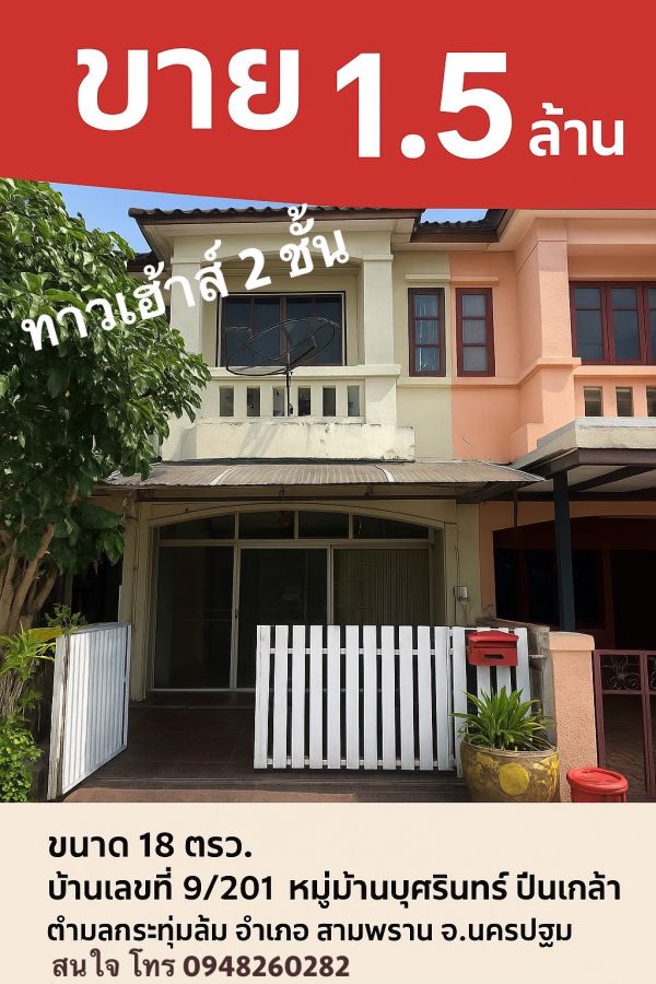 ขายทาวน์เฮ้าส์ 2 ชั้น หมู่บ้านบุศรินทร์ ปิ่นเกล้า สาย 4 ทำเลดี อำเภอสามพราน จังหวัดนครปฐม