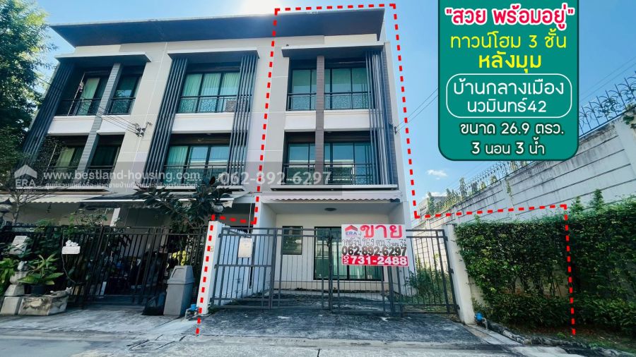 ขายด่วน! ทาวน์โฮม 3 ชั้น หลังมุม หมู่บ้านกลางเมือง นวมินทร์42 ขนาด 26.9 ตรว. ขาย 5.3 ล้านบาท สวยพร้อมเข้าอยู่ ทำเลทอง ย่านใจกลางเมืองที่สุดบอกเลยห้ามพลาด!!