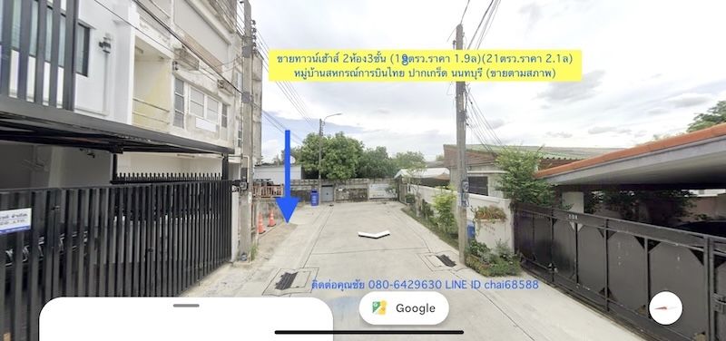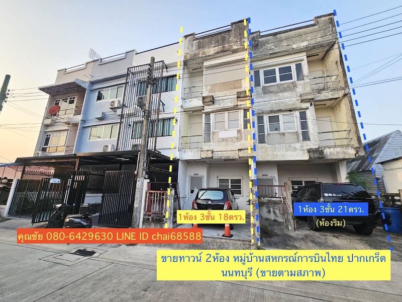 ขายทาวน์เฮ้าส์ในหมู่บ้านสหกรณ์การบินไทย ปากเกร็ด นนทบุรี 2ห้อง 3ชั้น 18ตรว.กับ 21ตรว.(ห้องริม) ขายตามสภาพ เหมาะรีโนเวทขาย หรือให้เข่า ทำเลดี ราคา 1.9ล/2.1ล สนใจติดต่อคุณช้ย 080-6429630 LINE ID chai68588