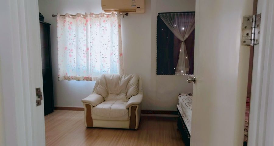 ข้างล่างพื้นปูด้วยกระเบื้องคุมโทนสีครีม ข้างบน มี 3 ห้องนอน พื้นด้วยลามิเนต