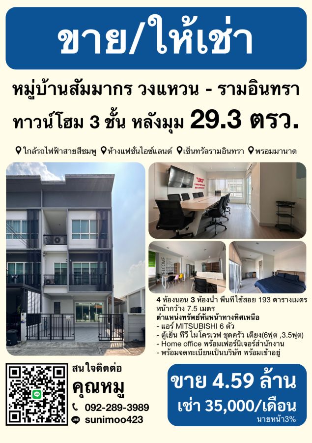 ขายหรือเช่า ทาวน์โฮม 3 ชั้น หมู่บ้านสัมมากร อเวนิว รามอินทรา-วงแหวน